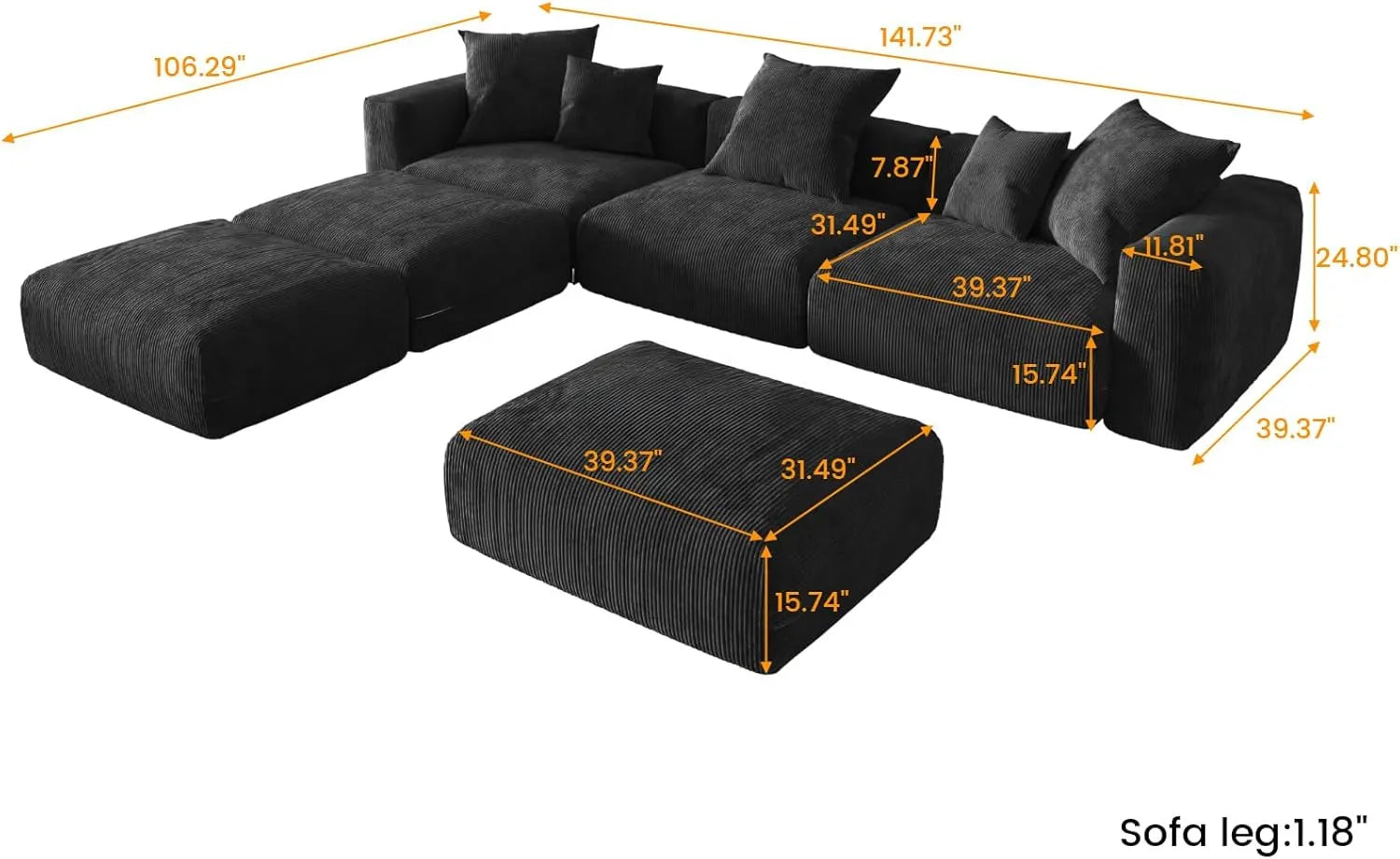 6-Piece Corduroy Black Hidden Sleek Sofa Legs Pit Sectionals 3-seaters with 3-Ottomans