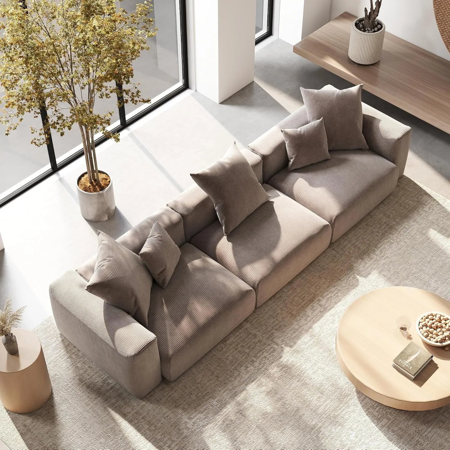 The couch is upholstered in a soft and warm corduroy fabric, adding a cozy and welcoming texture to your living space.