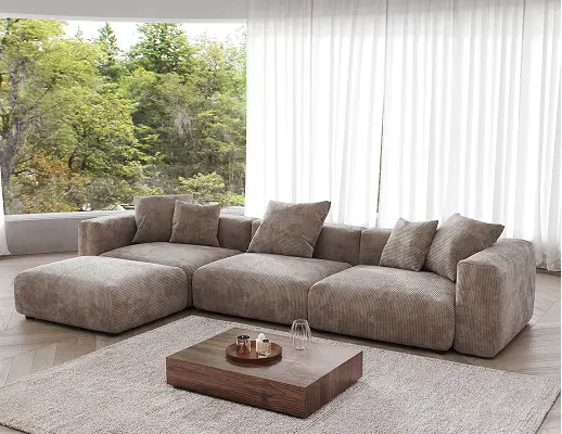 The couch is upholstered in a soft and warm corduroy fabric, adding a cozy and welcoming texture to your living space.