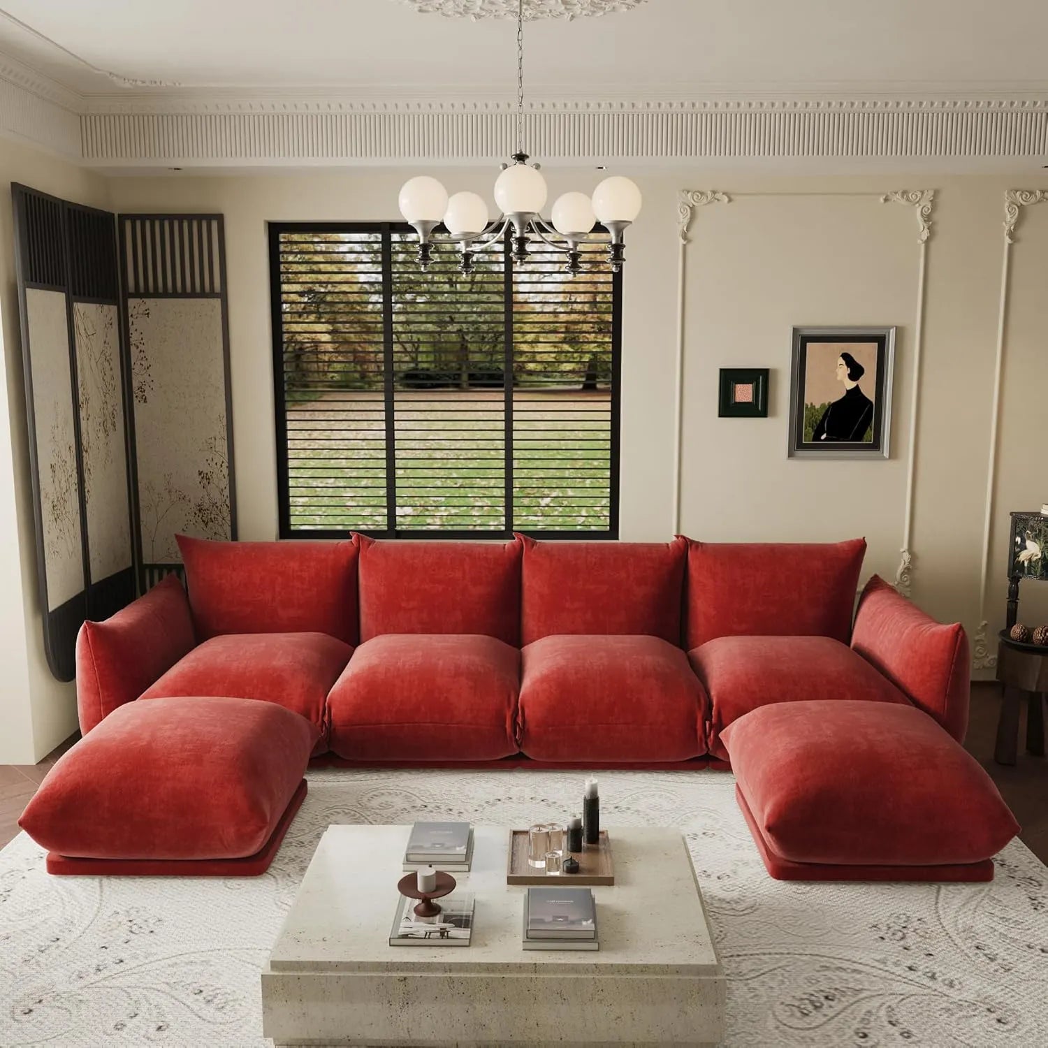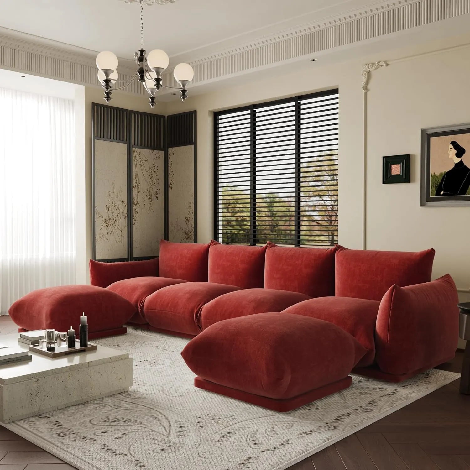 Exclusive Modern Sectional Couches | 6-Piece Chenille Orange Smooth Sculptural Lines U-Shaped Sectionals 4-seaters with 2-Ottomans
