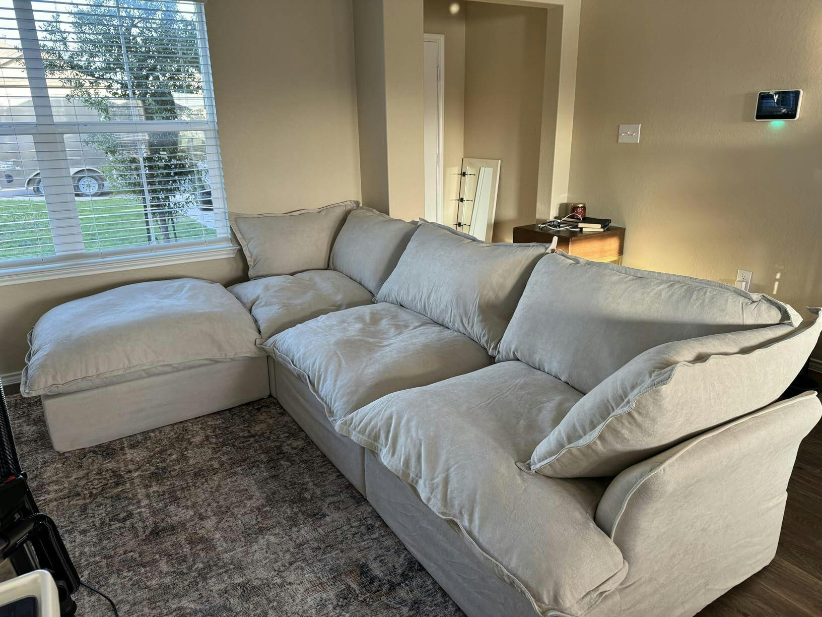 I work remote some days and end up here more than at my desk. Linen stays breathable even when AC off. My cat sleeps on the ottoman and hasn’t scratched it up yet.