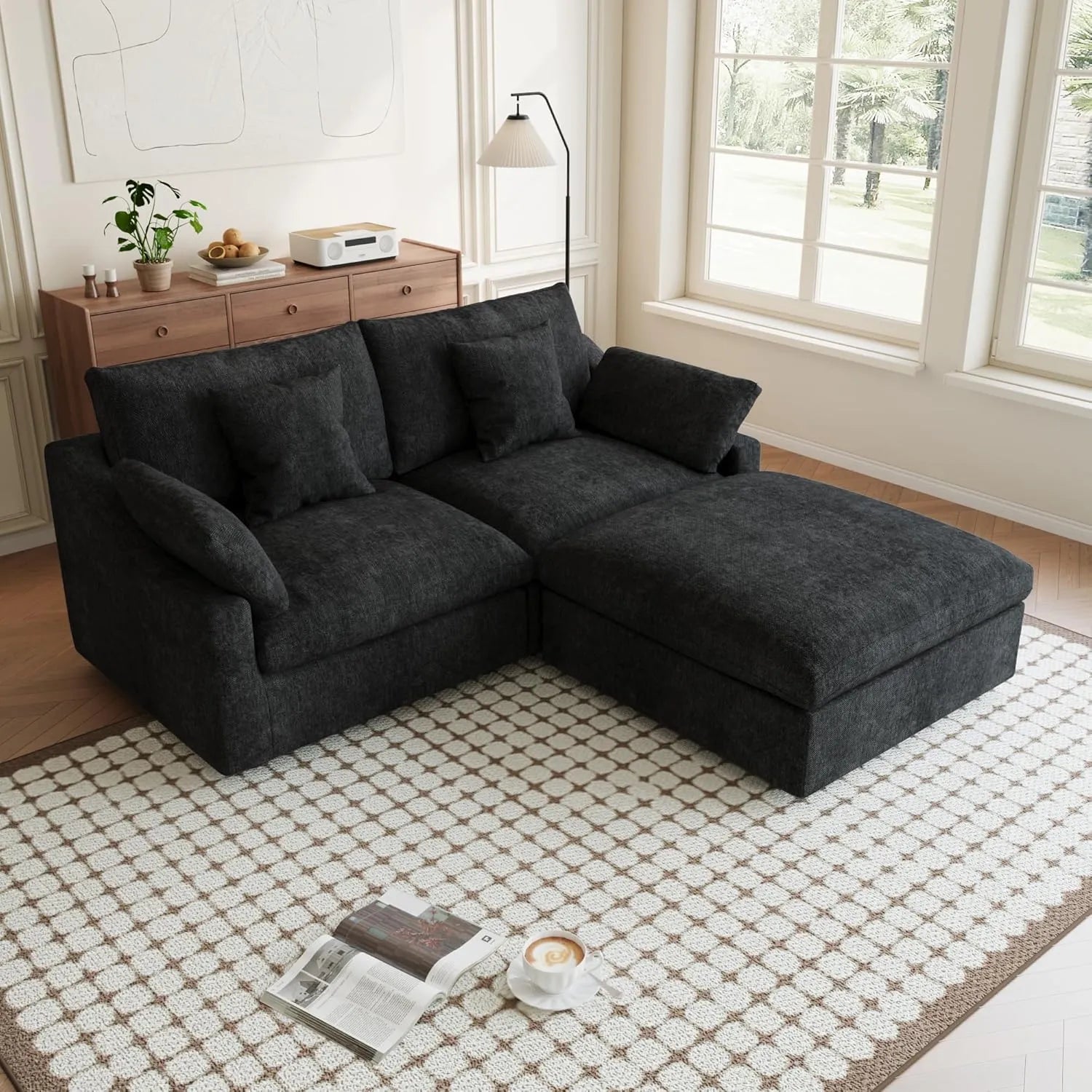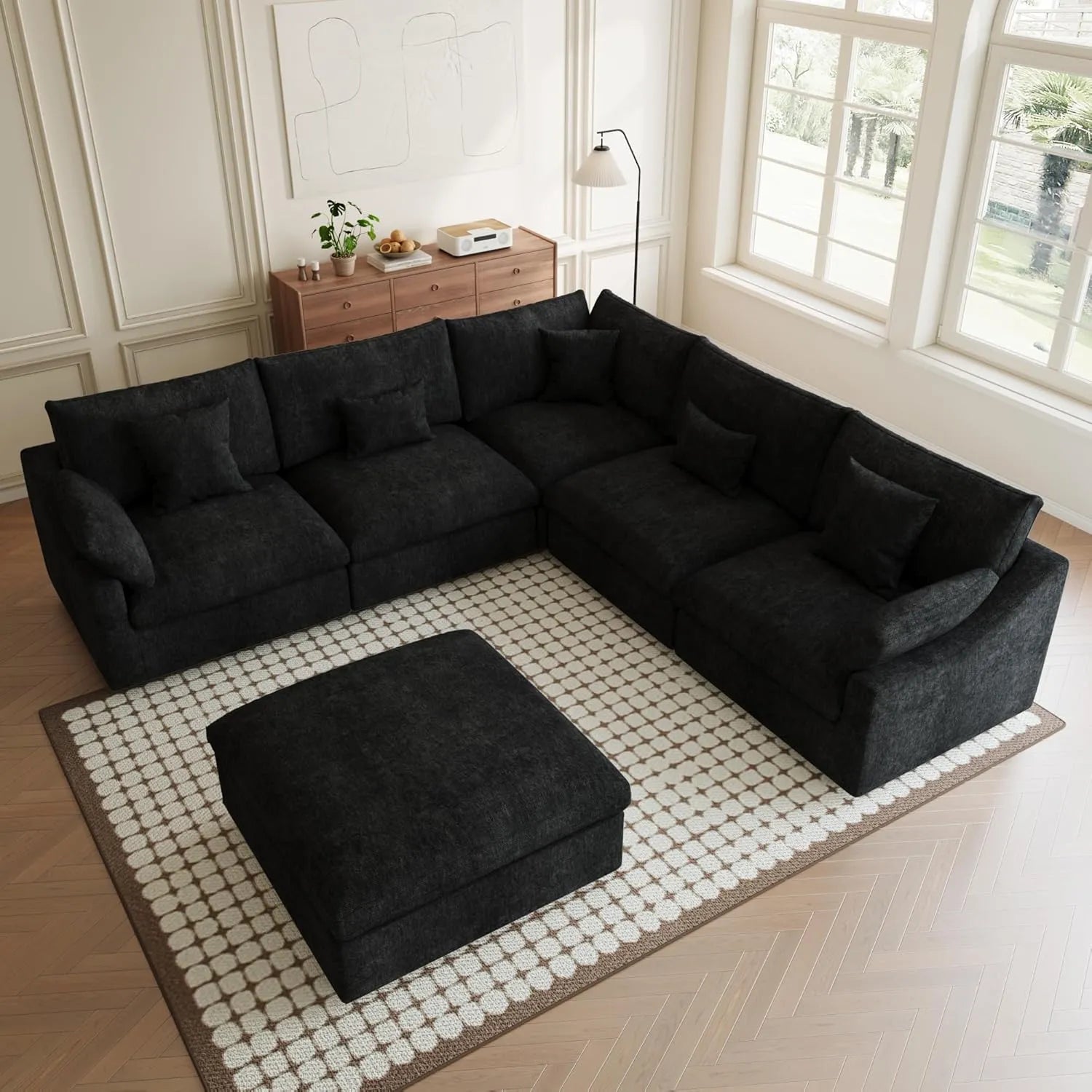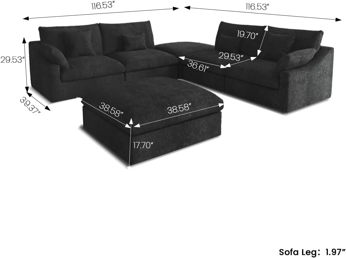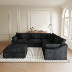 Premium Slope Cloud Sectional Couches | 6-Piece Linen Black Comfy Sloped Arms Sofa Sets 4-seaters with 2-Ottomans