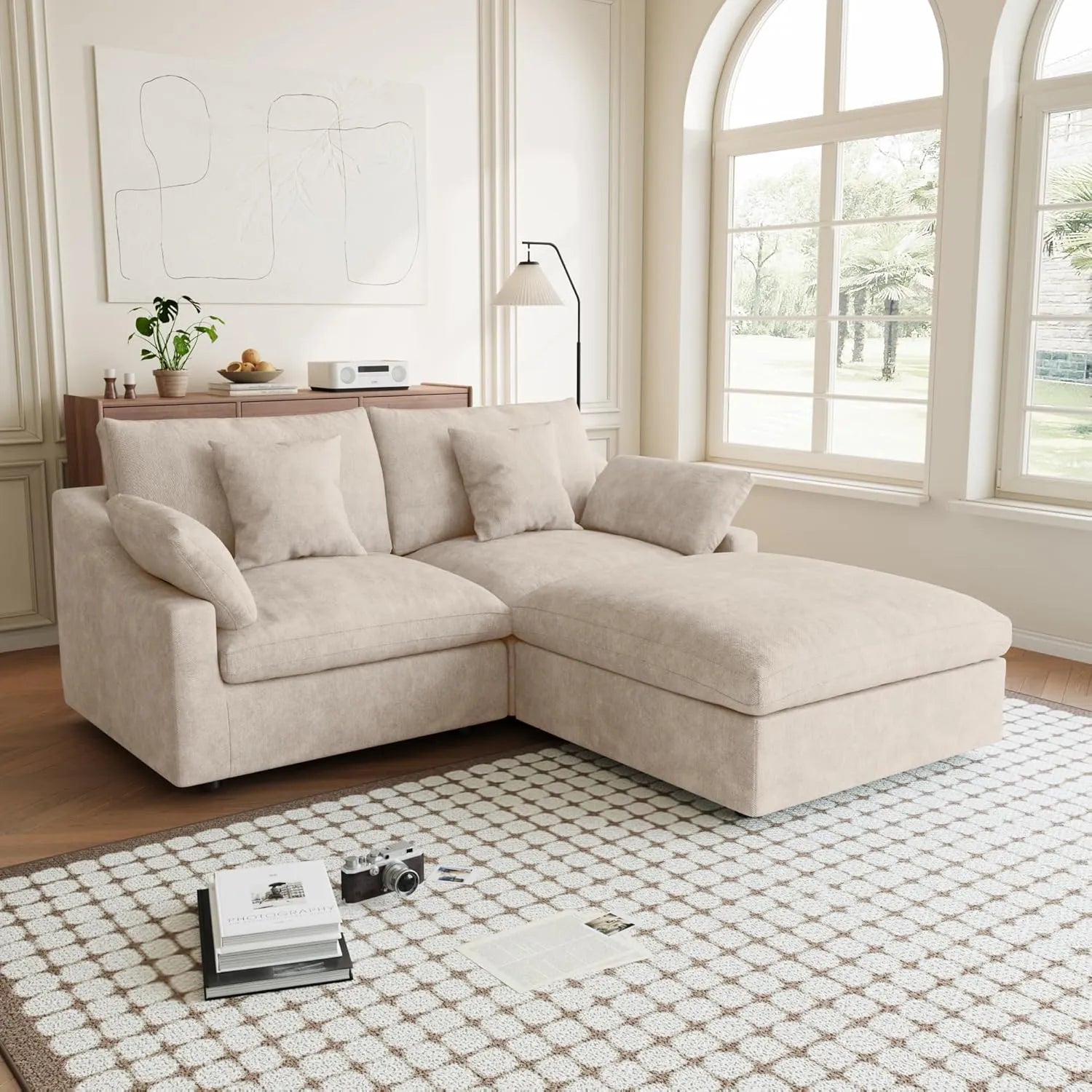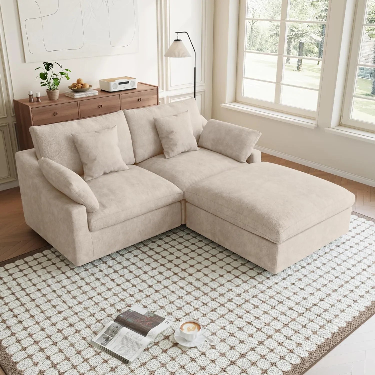 Premium Slope Cloud Sectional Couches | 3-Piece Linen Khaki A Simple Beachy Look Chaise Sectionals 2-seaters with 1-Ottomans