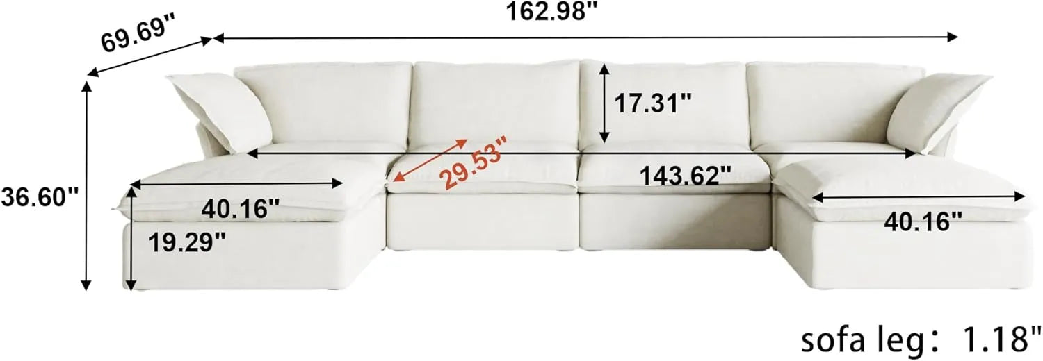 Premium Linen Cloud Sectional Couches | 6-Piece Linen White Oversized Cushions U-Shaped Sectionals 4-seaters with 2-Ottomans