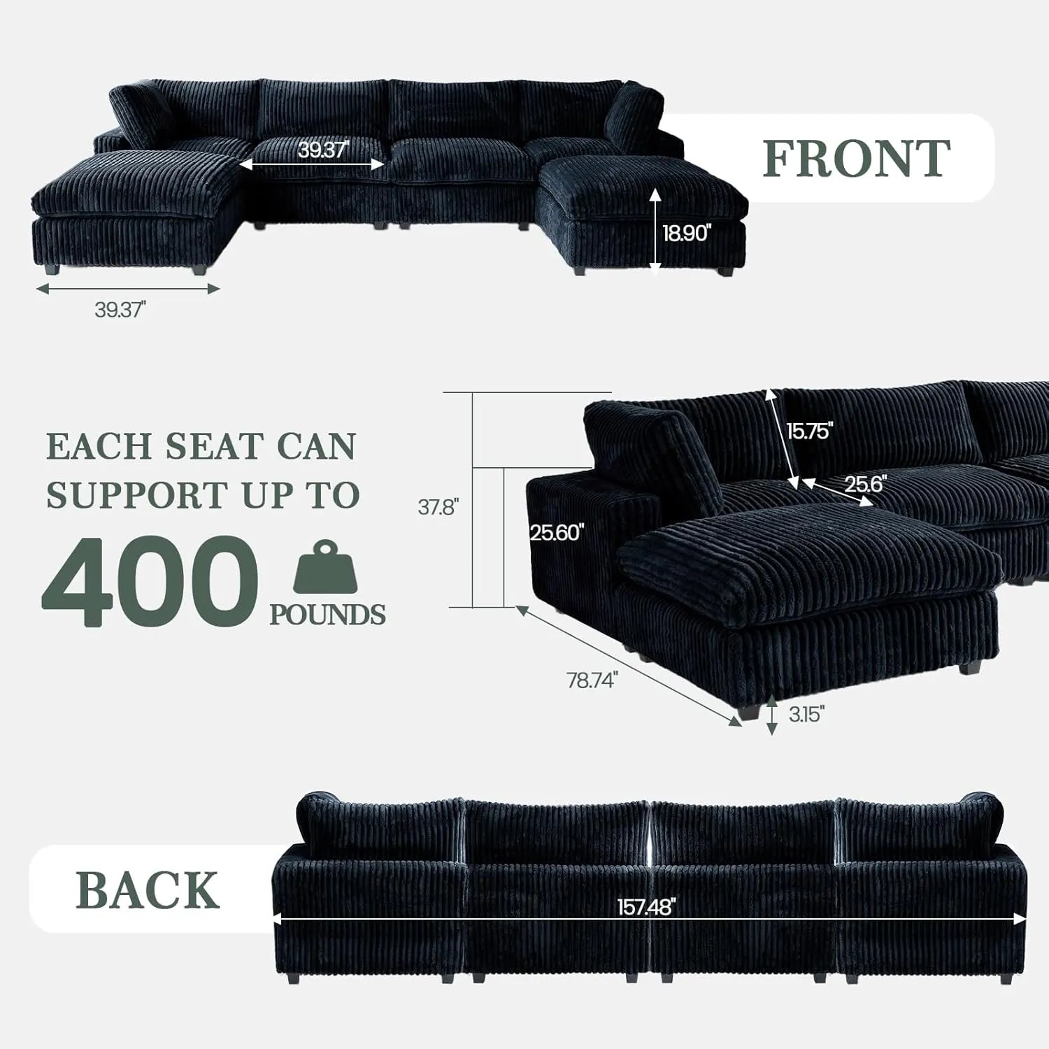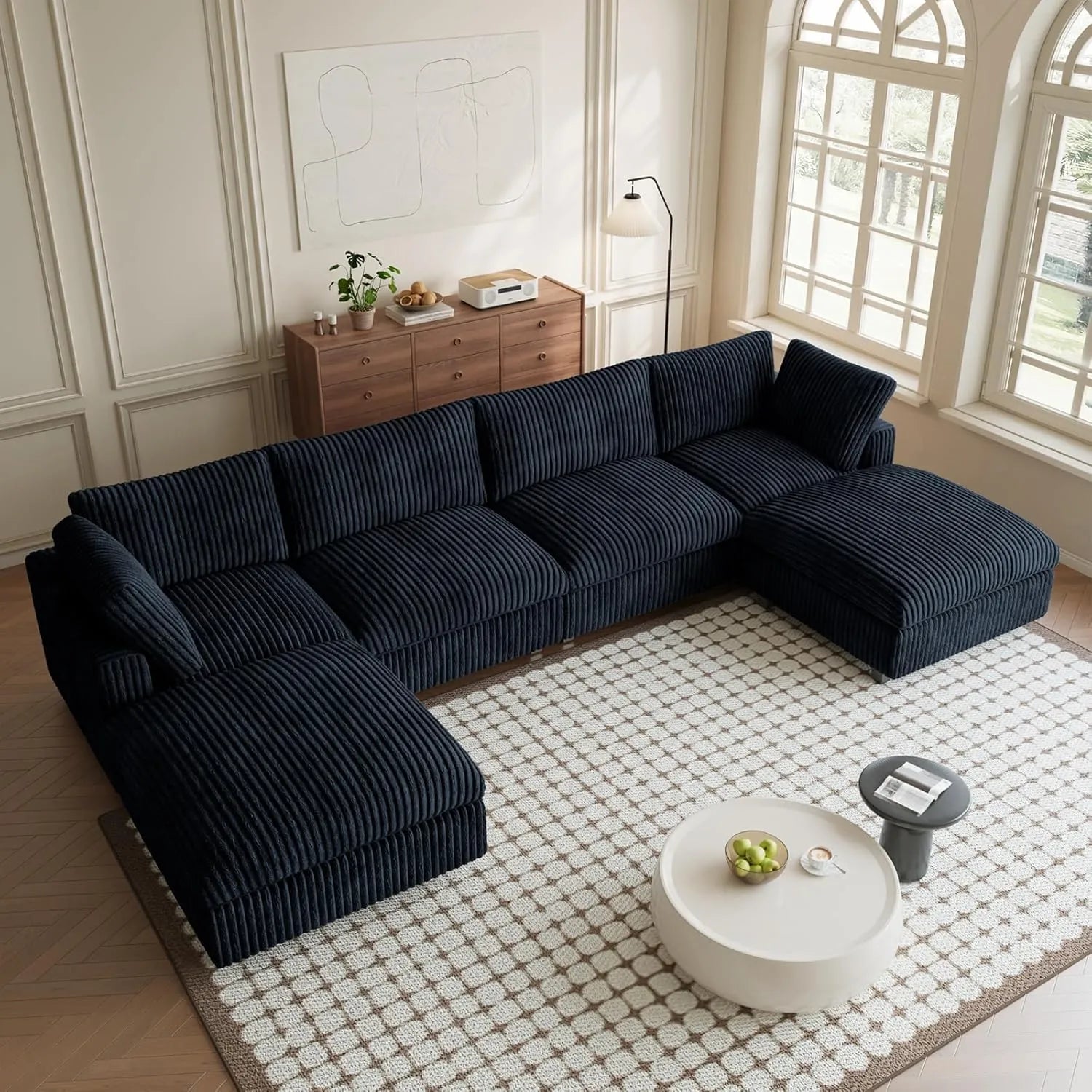 Premium Classic Cloud Sectional Couches | 6-Piece Plush Fabric Black Sink-In Spacious Seating U-Shaped Sectionals 4-seaters with 2-Ottomans