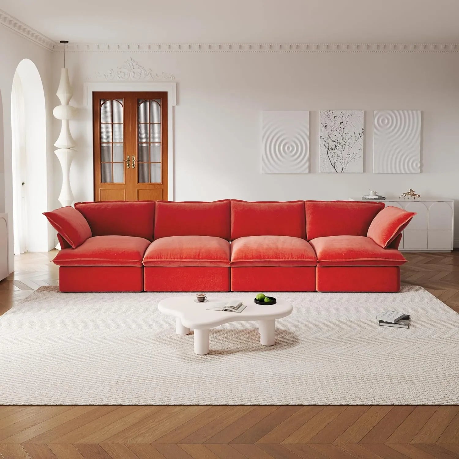 Premium Velvet Cloud Sectional Couches | 4-Piece Velvet Red Rich Fancy Velvet Couch Sectionals 4-seaters